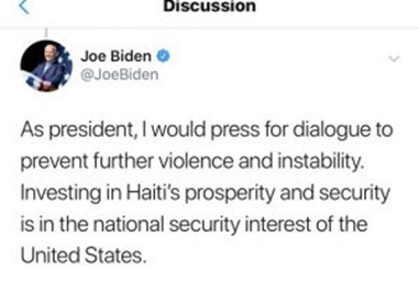 Biden ki estime Trump pa menm manke fè yon tankou pou wè si li ta arive fè aktè politisyen ayisyen yo debouche sou yon antant nan mawondaj kriz peyi Dayiti-a. Vis Pwezidan an rapouswiv pou di, “Si mwen te pwezidan, mwen tap arive pwomote dyalòg yon manyè pou evite tout vyolans ak enstabilite pwan chè nan peyi Dayiti” dapwè Biden, ki se youn nan kandida demonkrat pou pwochen kous pwezidansyèl yo nan peyi Etazini.