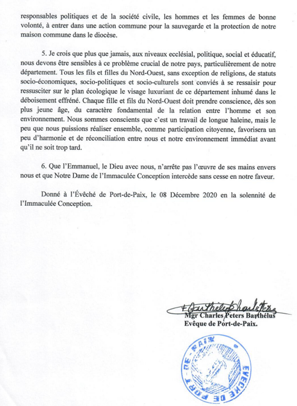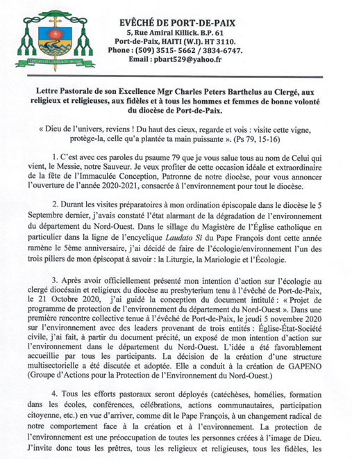 Oui, le Monseigneur Citoyen a été tellement bouleversé par l’environnement dans mon département natal que, dans sa lettre pastorale du 8 décembre pour la Fête patronale de la paroisse, il a annoncé sa décision « de faire de l’environnement l’un des 3 piliers de son épiscopat, à savoir la LITURGIE, la MARIOLOGIE et l’ ÉCOLOGIE ou ENVIRONNEMENT ».
