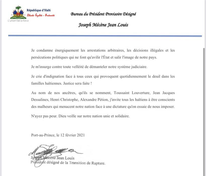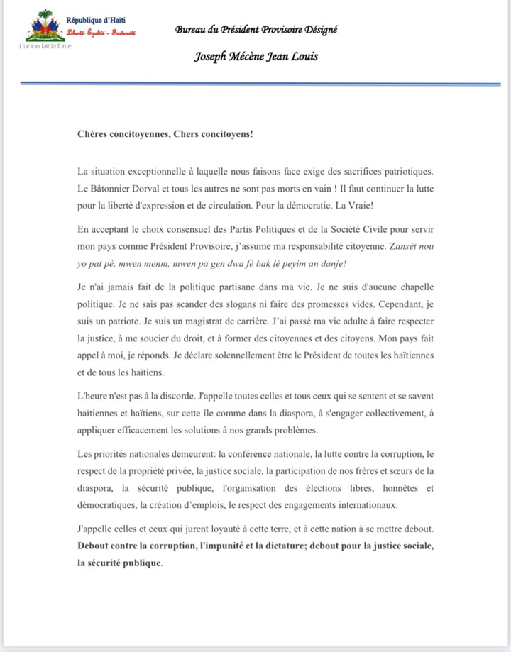 Message du Président provisoire désigné de la République D’Haiti: Joseph Mécène Jean Louis