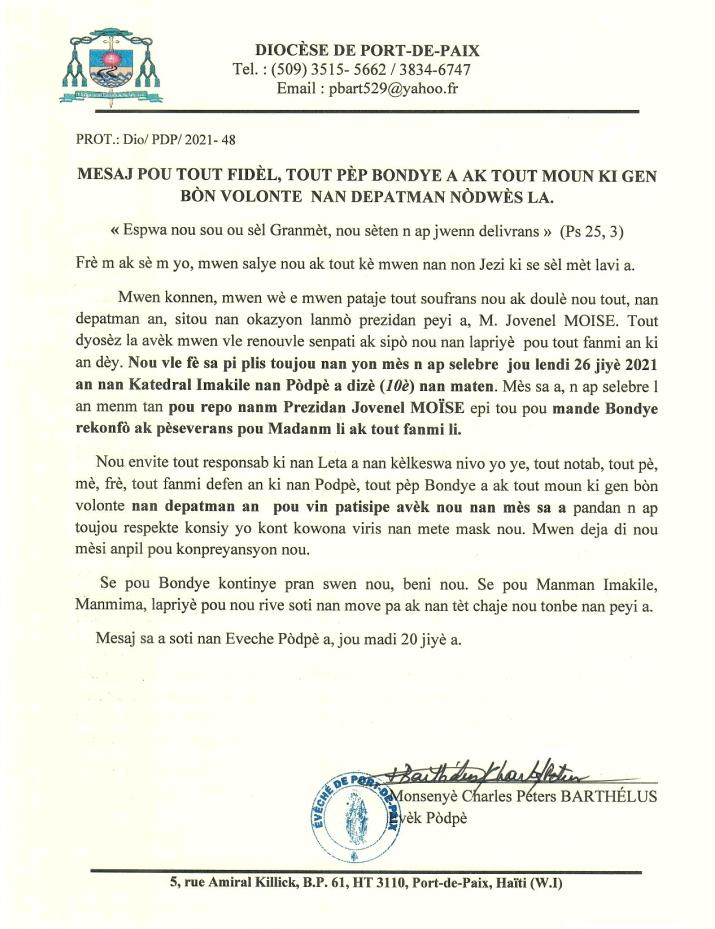Dyosèz Pòdpè : Mesaj pou tout Fidèl, tout pèp Bondye a ak tout moun ki gen bòn volonte nan depatman Nòdwès la