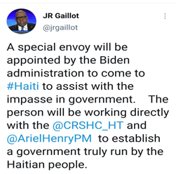 Wachennton______(TRiboLAND) Pwezidan peyi Etazini an ap voye yon anvwàye espesyàl avan lontan nan peyi Dayiti. Yon parèy vizit pwàl antre nan kàd pou ede gouvènman federal peyi Dayiti a ki anbweye sou back soti nan enpas difisil ke l’ap fè fas la. Delege ou anvwàye espesyàl la ap genyen pou chita travay ak @CRSHC_HT ak @Ariel Henry yon fason pou mete sou pye yon veritab gouvènman ke ayisyen yo ap rele chèmèt chèmètrès.