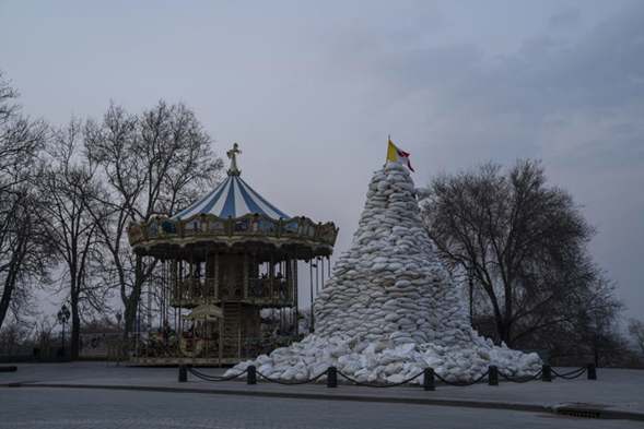 DOSSIER – Le monument du duc de Richelieu, est recouvert de sacs de sable à côté d’un carrousel, à Odessa, en Ukraine, le 24 mars 2022. Le port de la mer Noire exploite ses plages et se précipite pour se défendre d’un destin de style Marioupol. Certains responsables occidentaux pensent que la ville, chère aux Ukrainiens, pourrait être la prochaine. (AP Photo/Petros Giannakouris, File)