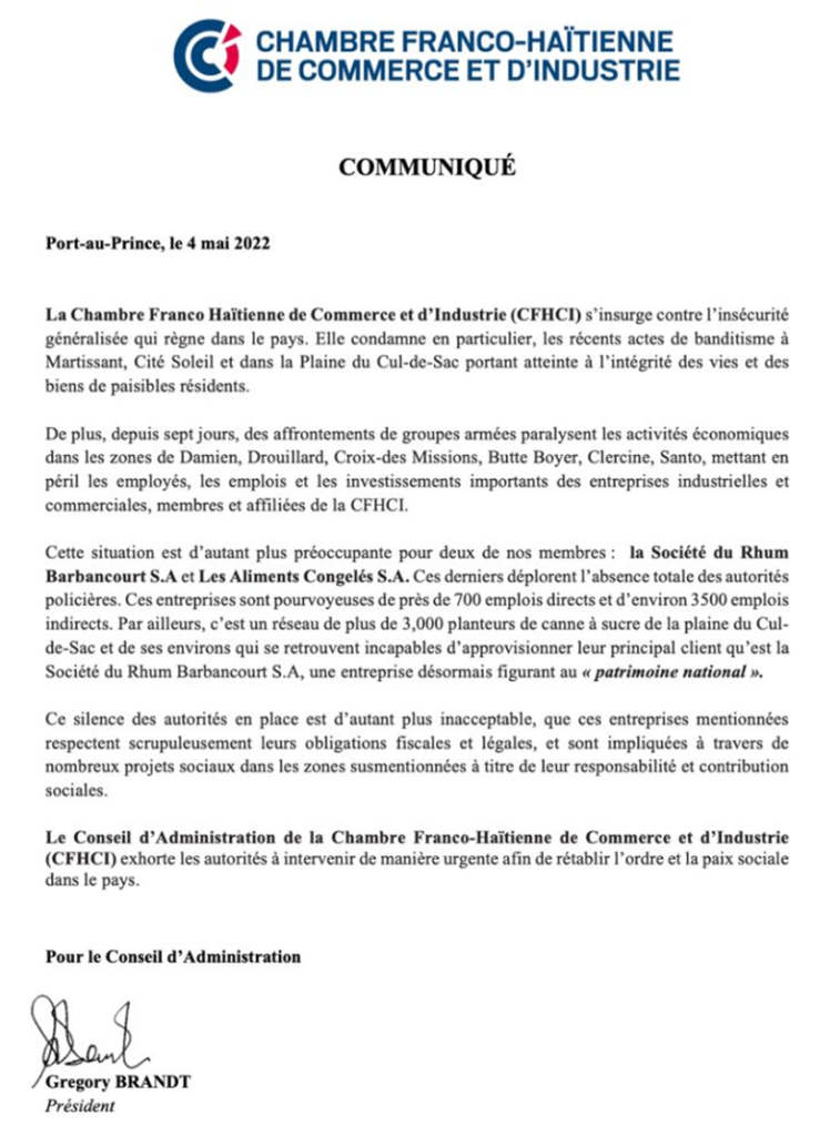 Chambre franco-haïtienne de commerce et d’industrie : Communiqué