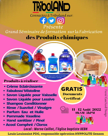 Média network TRiboLAND.com lanse, pou yon lòt fwa ankò, yon gran seminè sou fòmasyon fabrikasyon pwodwi chimik ; sèt fwasi nan Polen/Lakòn, komin Pòdpè, sòti jedi 11 pou rive vandredi 12 dawout 2022 a, swa 8h-4h.