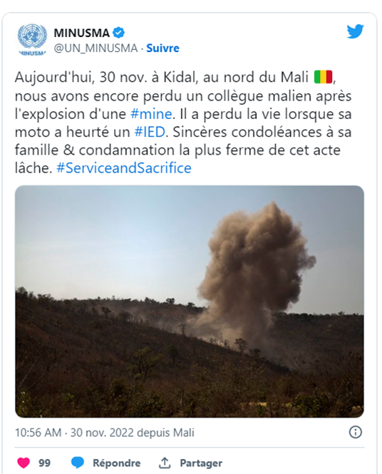 « Aujourd’hui, 30 novembre à Kidal, au nord du Mali, nous avons encore perdu un collègue malien après l’explosion d’une mine. Il a perdu la vie lorsque sa moto a heurté un engin explosif improvisé« , a écrit mercredi la mission de l’ONU sur twitter avant de condamner avec fermeté de cet acte lâche et barbare.