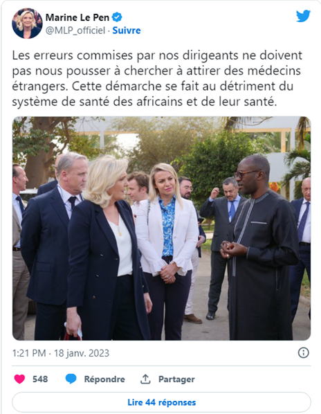 « Les erreurs commises par nos dirigeants ne doivent pas nous pousser à chercher à attirer des médecins étrangers. Cette démarche se fait au détriment du système de santé des africains et de leur santé », a indiqué Marine Le Pen.