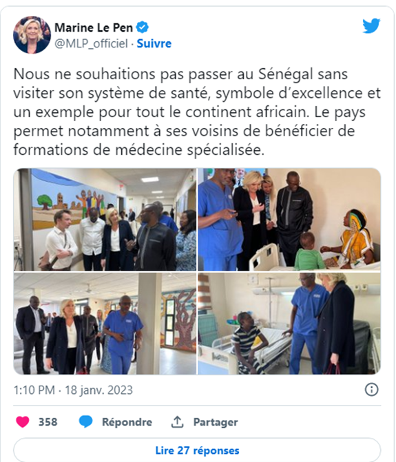 « Nous avons visité aujourd’hui le centre hospitalier universitaire de Fann et échangé avec la direction autour des enjeux de la coopération entre la France et le Sénégal en matière de santé. Nous ne souhaitions pas passer au Sénégal sans visiter son système de santé, symbole d’excellence et un exemple pour tout le continent africain. Le pays permet notamment à ses voisins de bénéficier de formations de médecine spécialisée », a écrit Marine Le Pen sur Twitter.
