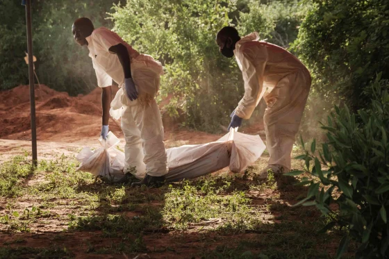 Les sites d’exhumation ont été bouclés et des équipes d’hommes, certains portant une salopette blanche et des masques, ont pu être vus emportant des cadavres enveloppés dans des sacs mortuaires bleus et blancs.